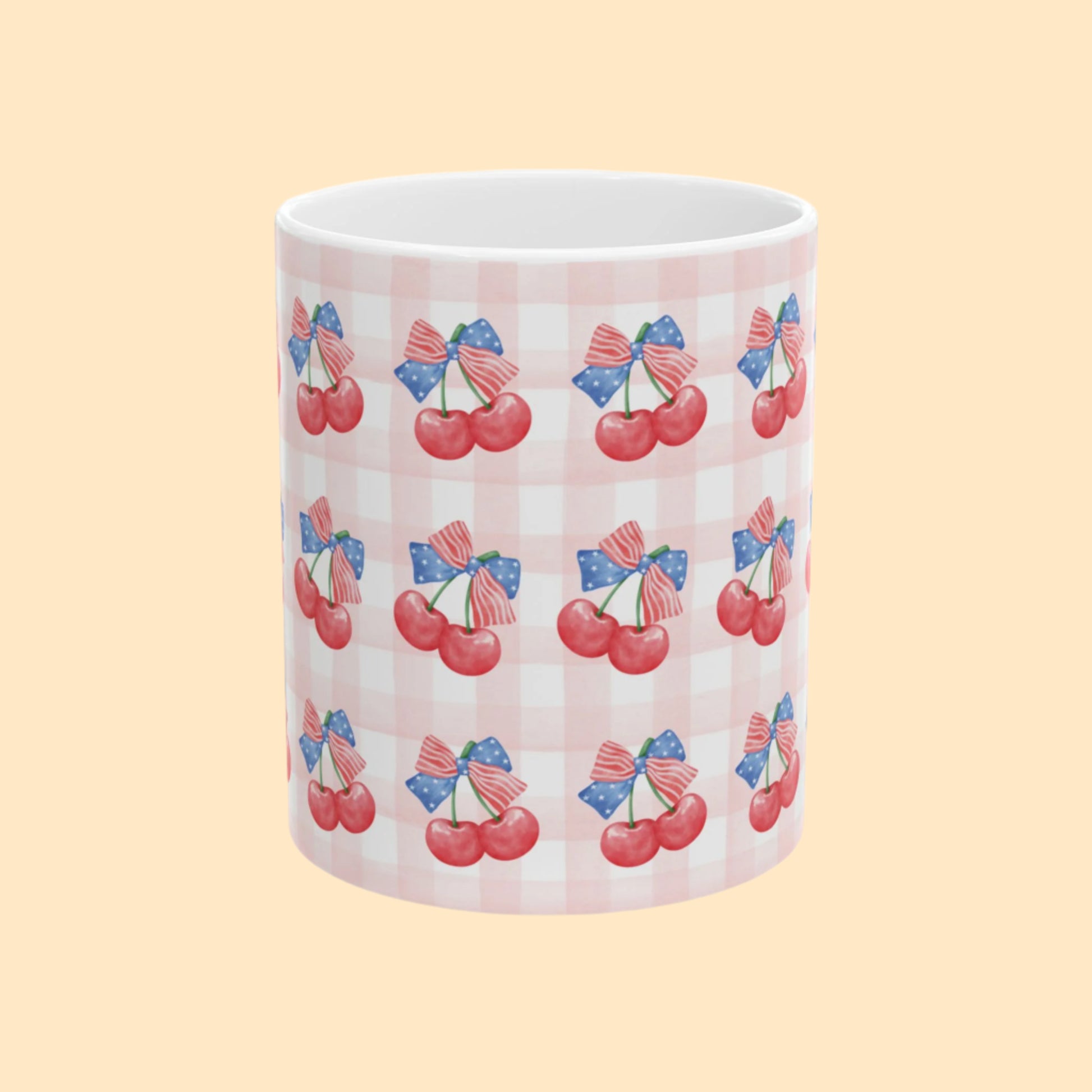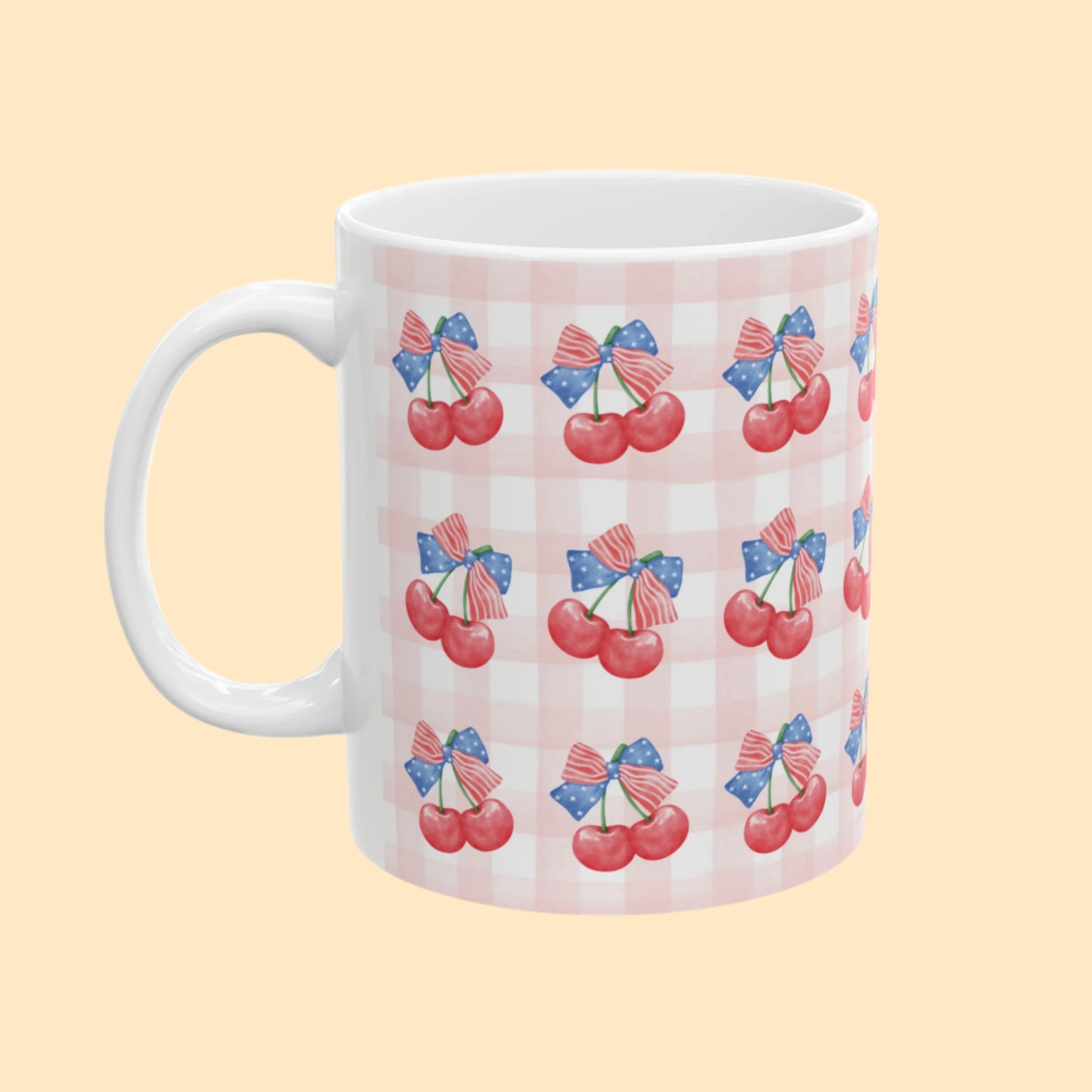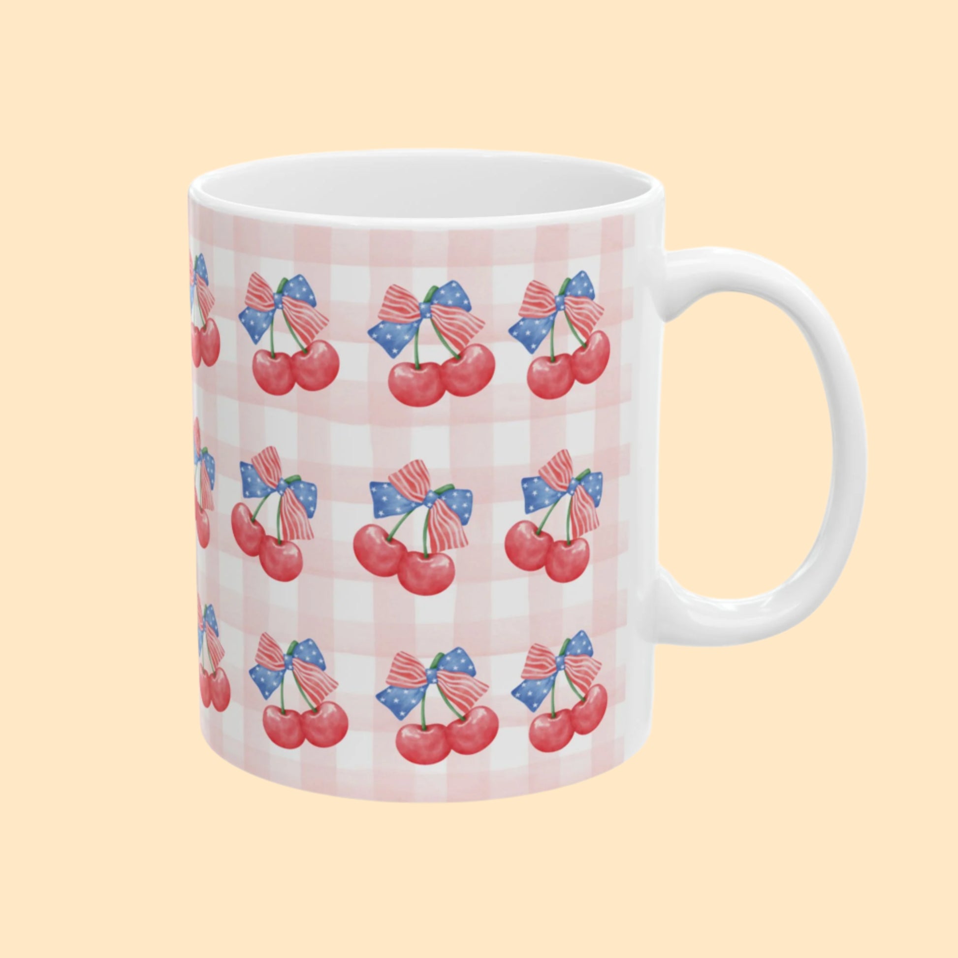 Sweet, classic, and bursting with summer charm—this patriotic cherry mug blends juicy watercolor cherries with red-white-blue ribbons and a gingham backdrop. A cozy nod to nostalgic Americana, it’s the perfect companion for your Fourth of July brunch, morning coffee at the farmers’ market, or summer picnic getaways.