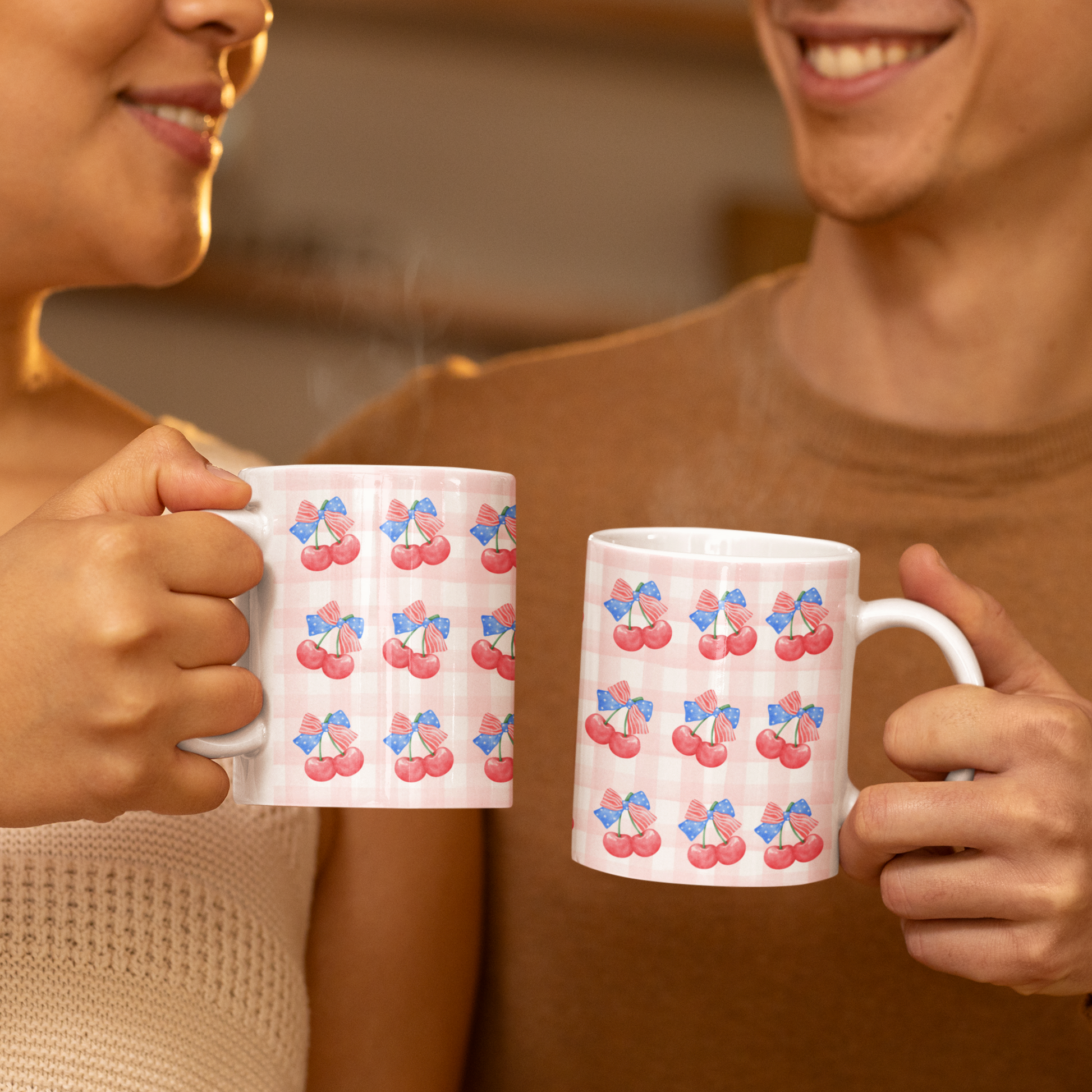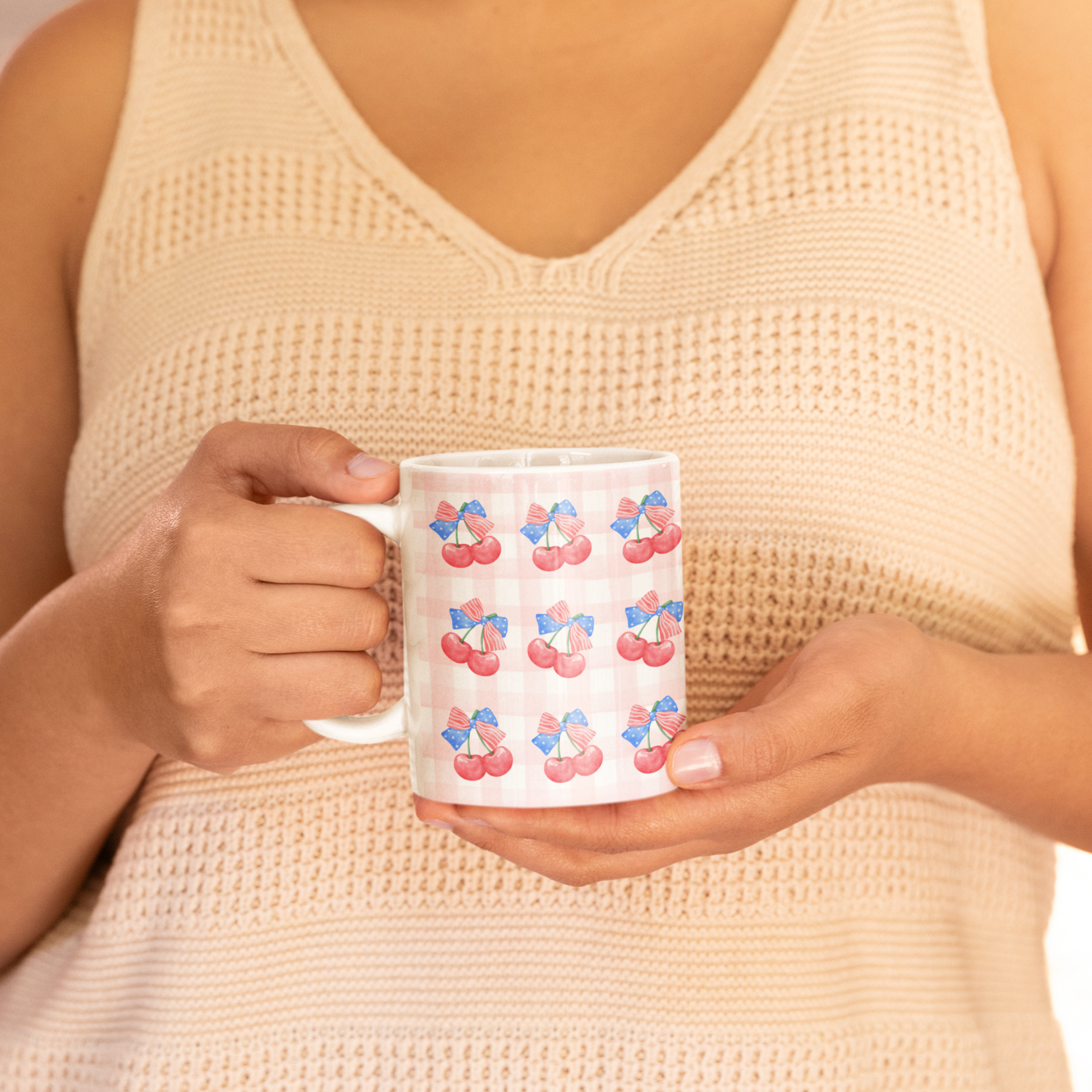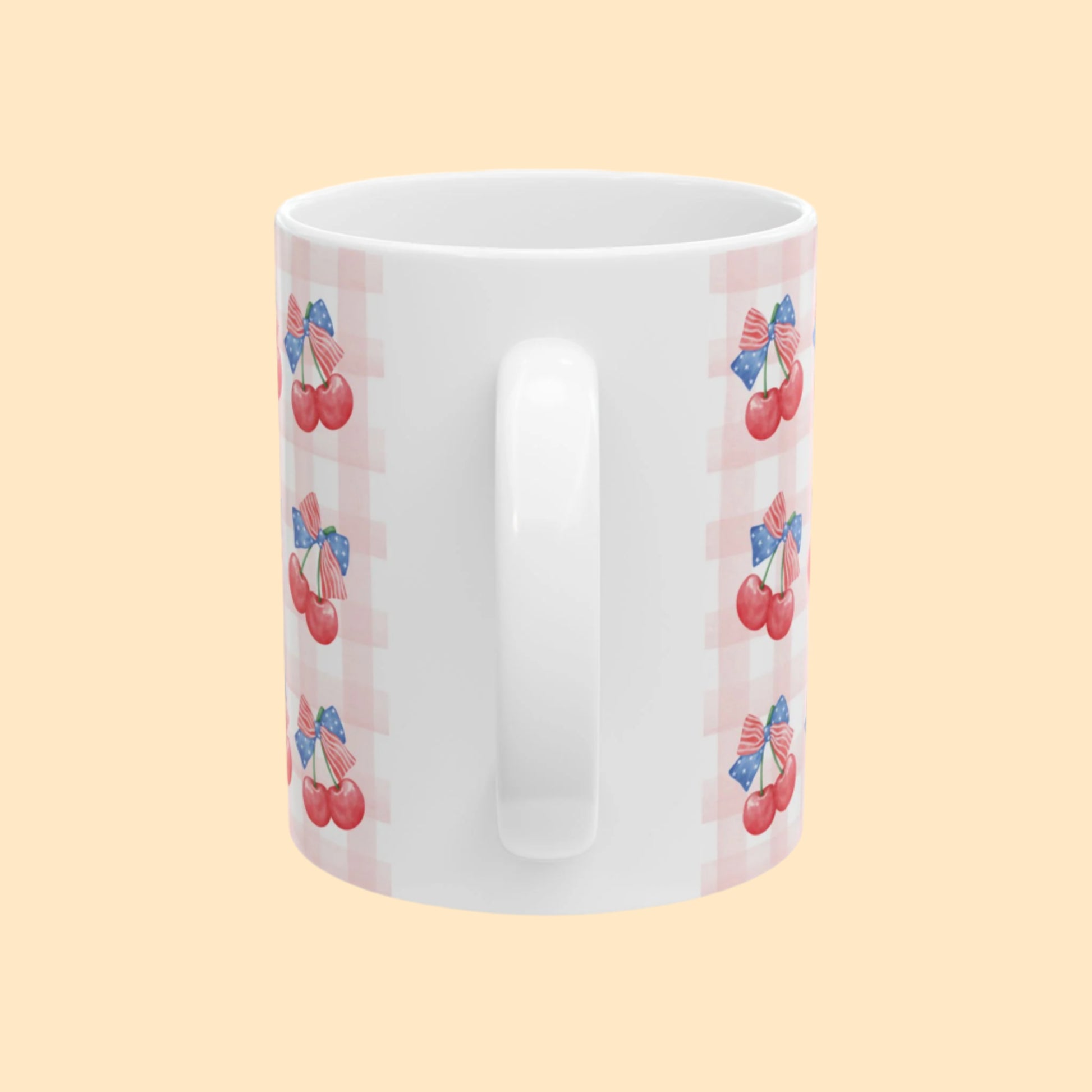 Sweet, classic, and bursting with summer charm—this patriotic cherry mug blends juicy watercolor cherries with red-white-blue ribbons and a gingham backdrop. A cozy nod to nostalgic Americana, it’s the perfect companion for your Fourth of July brunch, morning coffee at the farmers’ market, or summer picnic getaways.