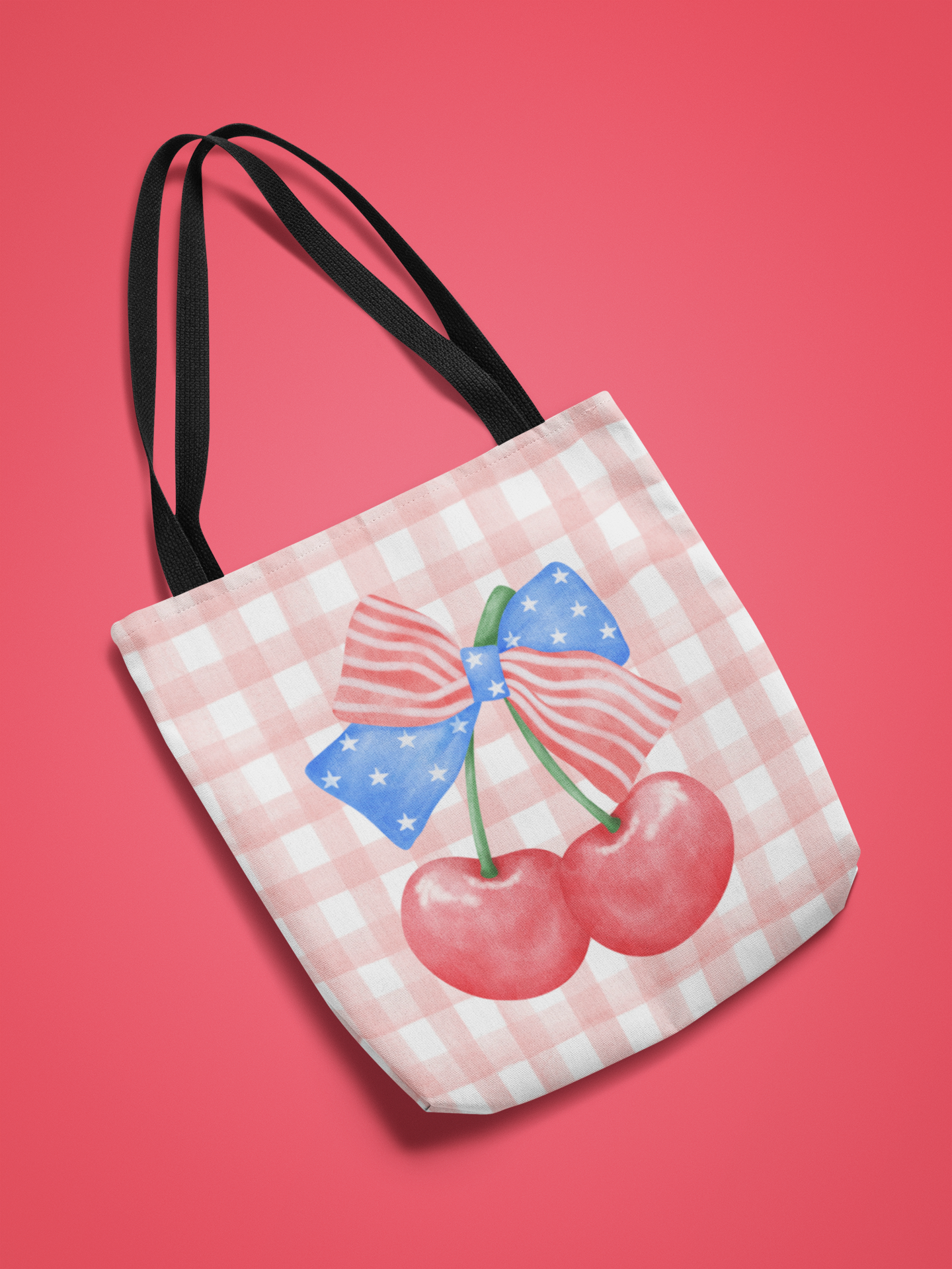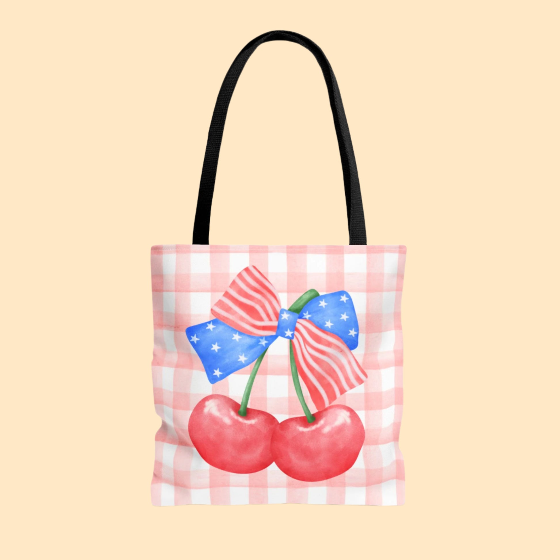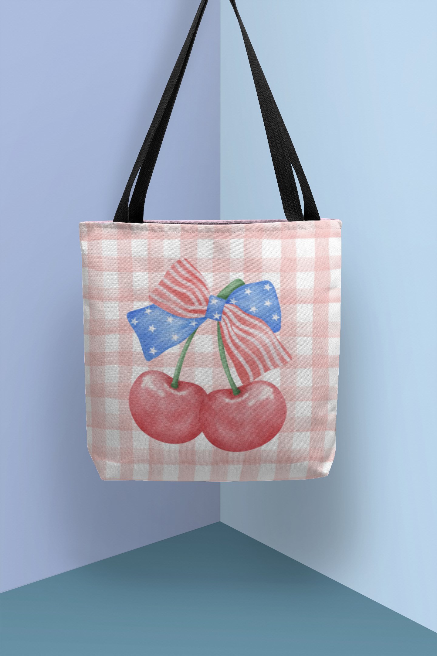 Sweet and classic with a patriotic twist. This watercolor tote features juicy cherries, gingham patterns, and red-white-blue ribbon details. A perfect companion for summer picnics, Fourth of July barbecues, and farmers’ market strolls.