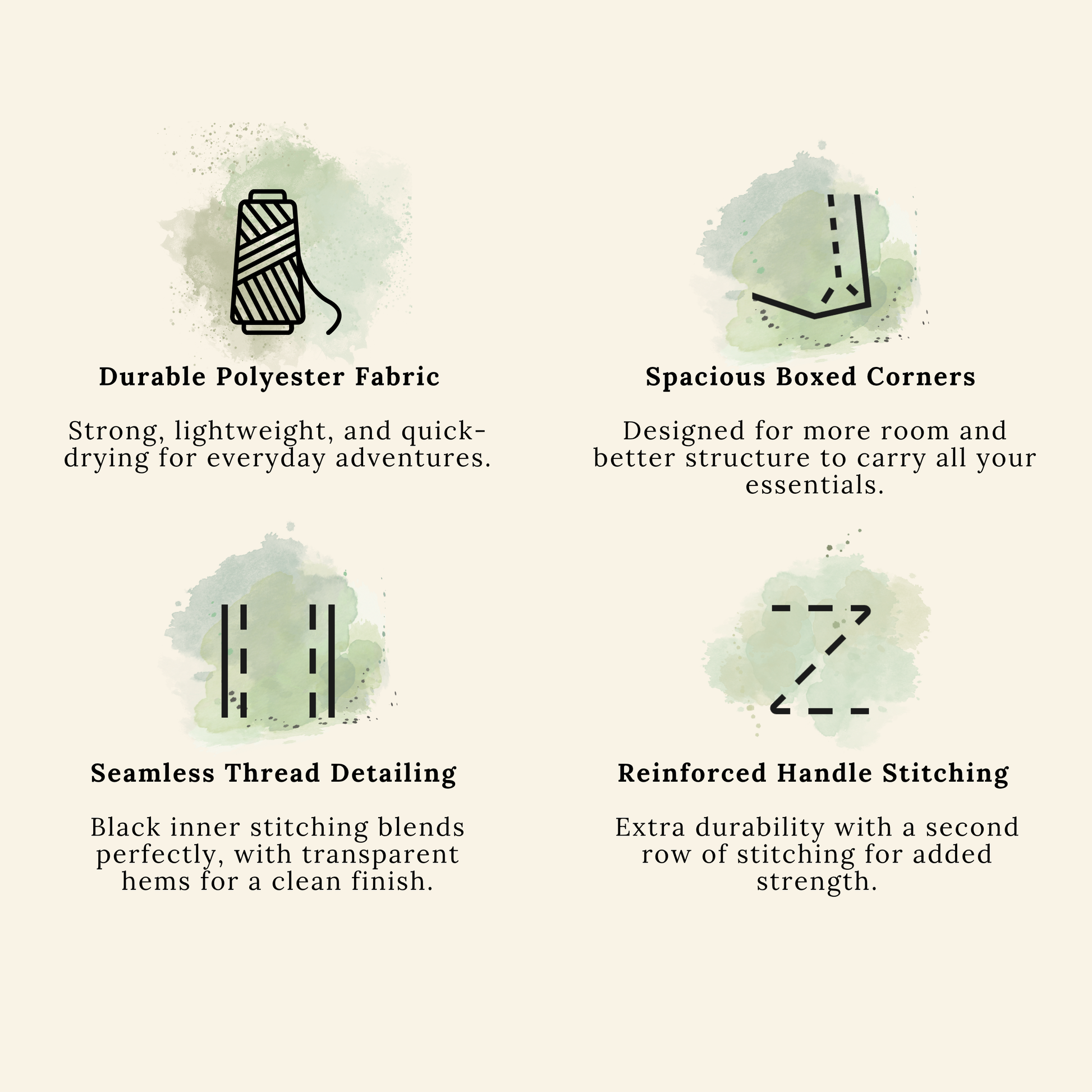 - Cotton webbing straps: comfortable and sturdy cotton webbing straps for easy carrying.
