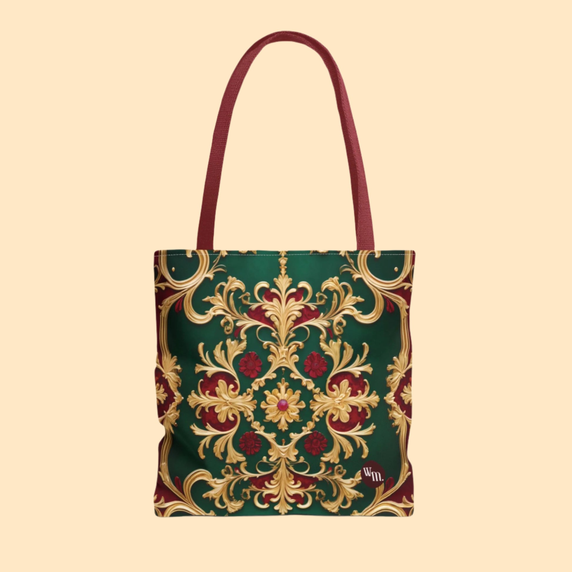 Inspired by the grandeur of Florentine Renaissance art, this tote features ornate scrolling patterns in deep green, rich burgundy, and gold, evoking the luxury and sophistication of historic Italy. The intricate details draw from the masterpieces of Florence, where craftsmanship and artistry flourished.
