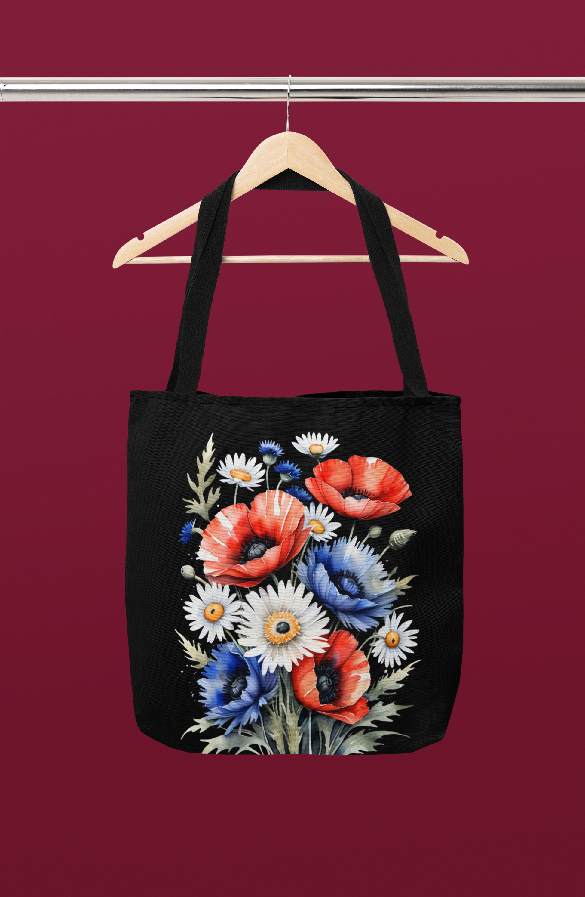 Bold and elegant, this design features a striking bouquet of red, white, and blue florals set against a dramatic dark background. A sophisticated take on Fourth of July style that transitions beautifully from day to night.