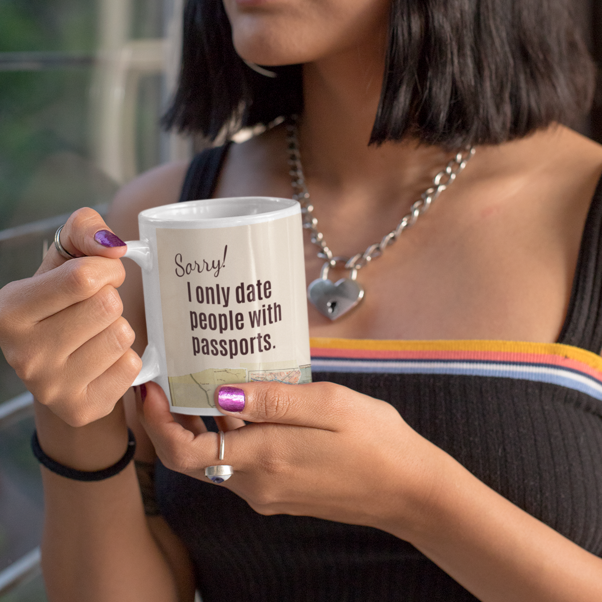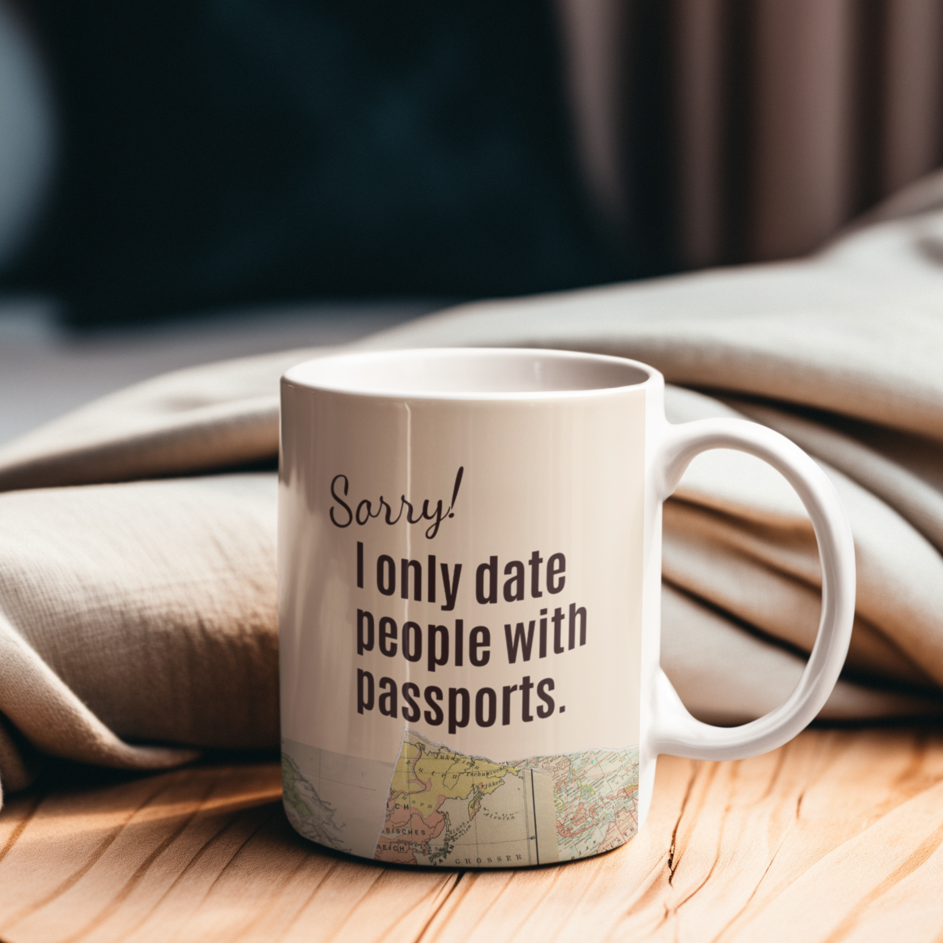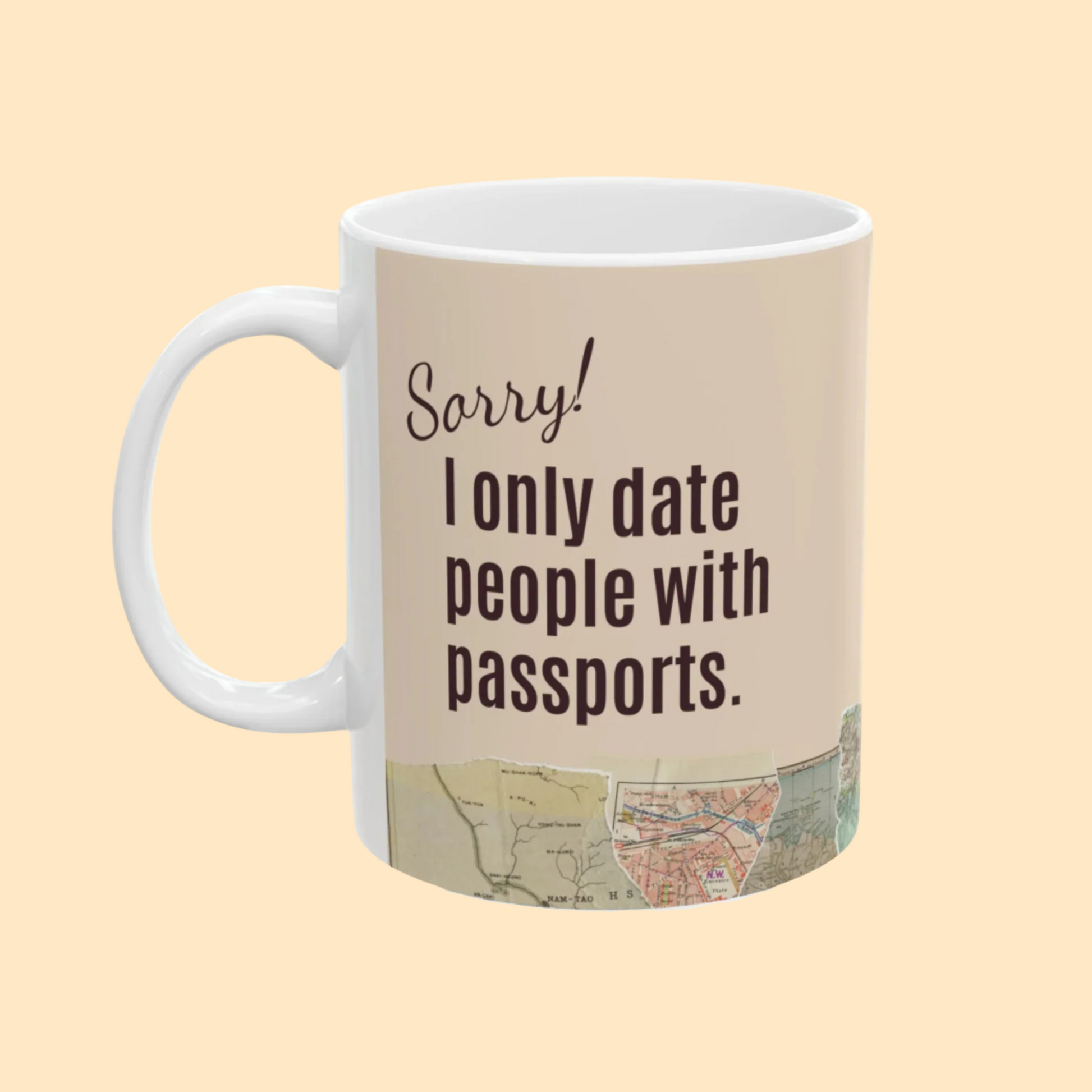 Let your coffee mug do the screening. This rustic-chic travel mug features a vintage map-inspired border and a cheeky phrase: “Sorry! I only date people with passports.” It’s a must-have for travelers who take love — and luggage — international. Perfect for sipping in the morning, sparking convos on the go, or gifting to your favorite globe-trotter with high standards.