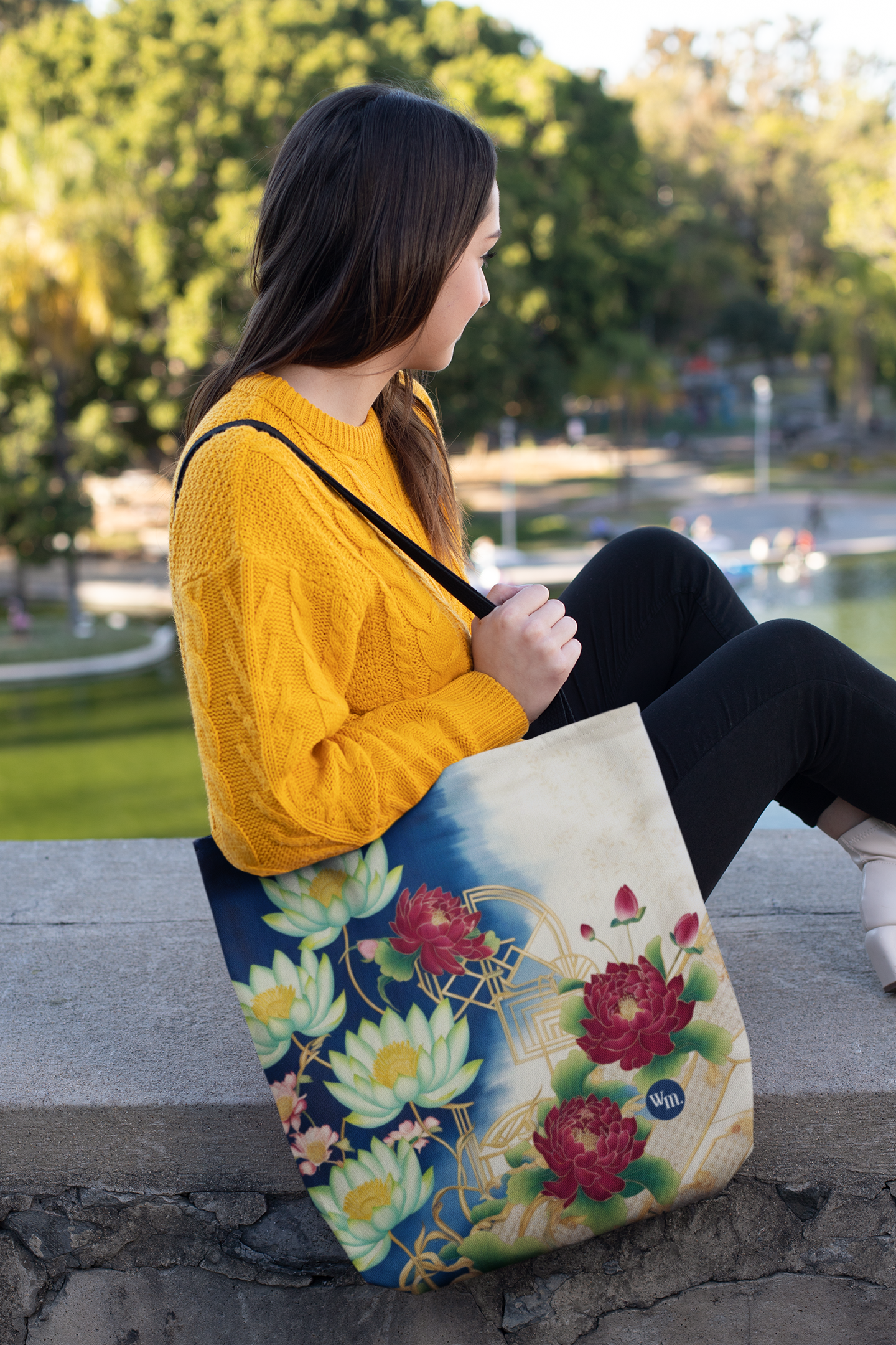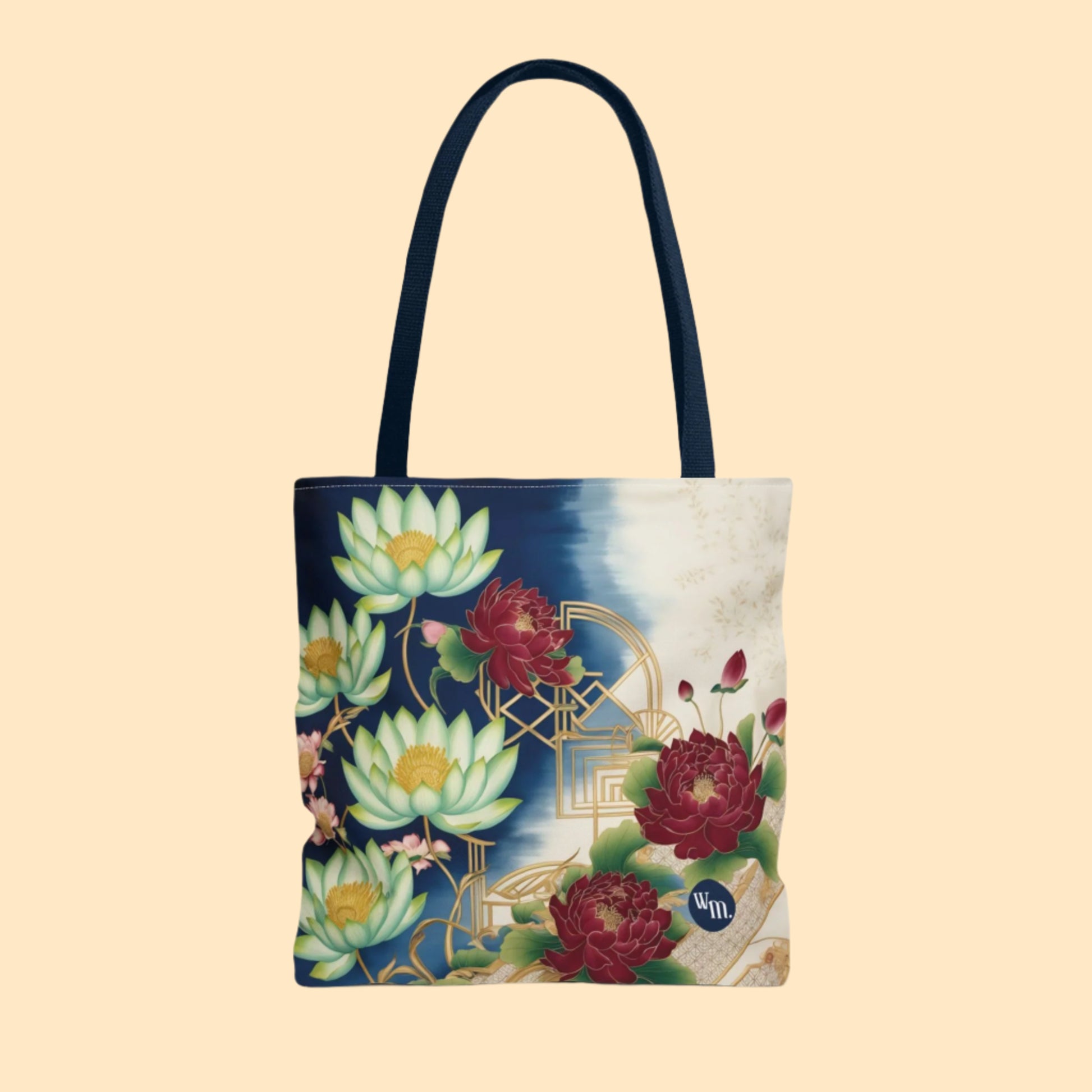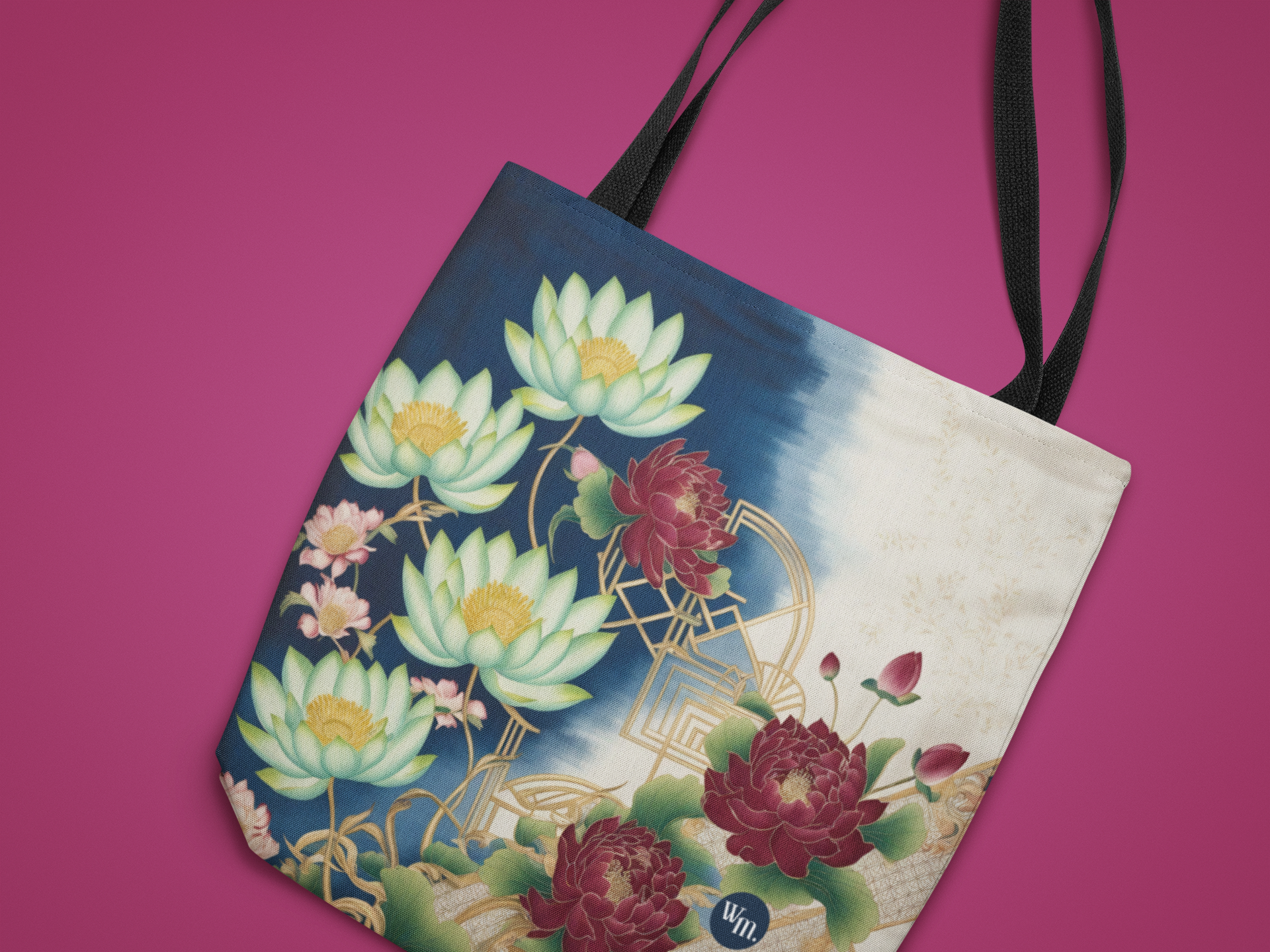 Immerse yourself in the tranquil beauty of a lotus pond, a cherished symbol in Korean culture, representing purity, enlightenment, and resilience. This tote captures the serene charm of floating lotus flowers against a dark blue and beige backdrop, blending traditional Korean motifs with a modern artistic touch.