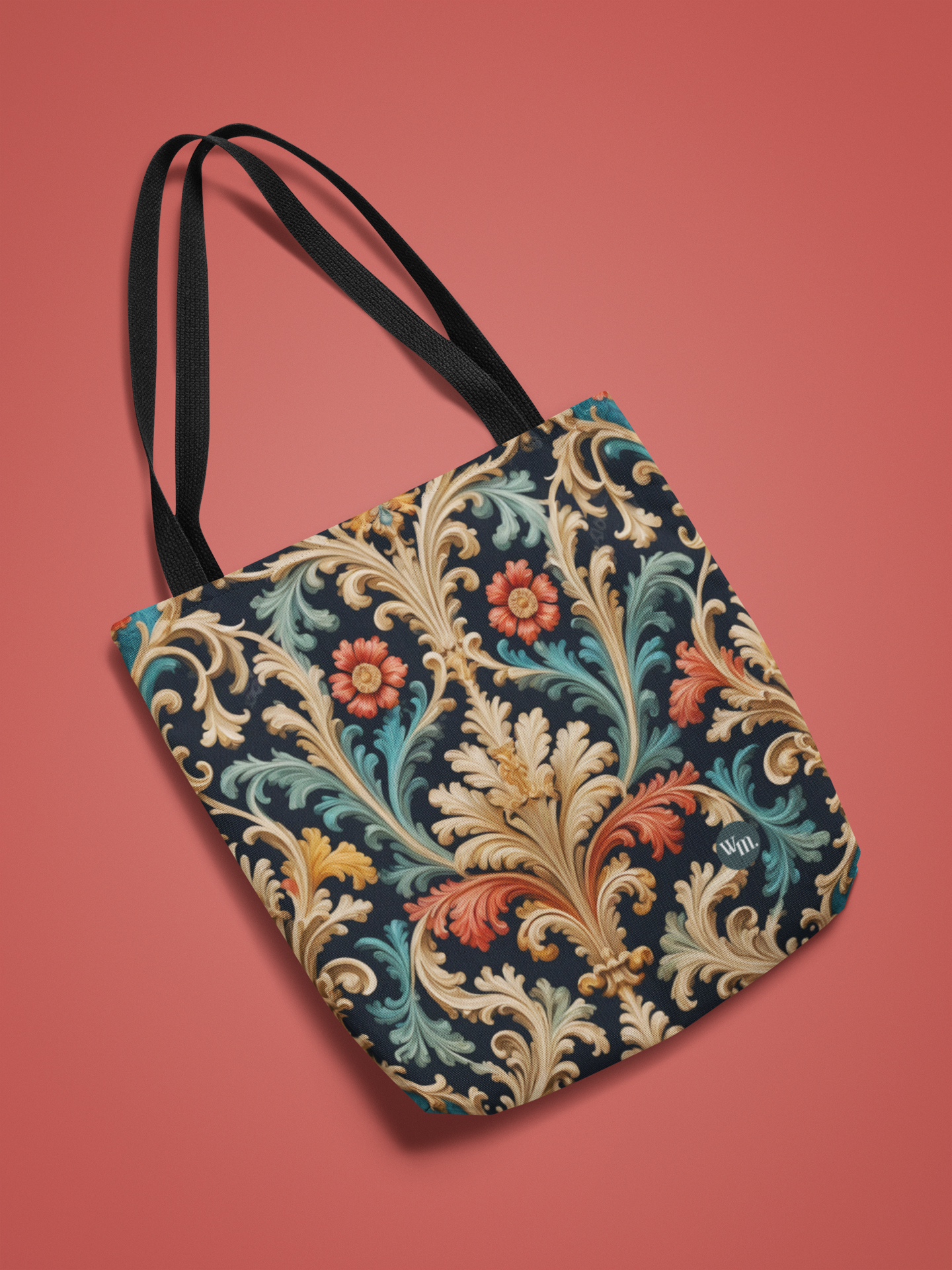 Inspired by the historic artistry of Florence, this Florentine-patterned tote features lush gold, green, and coral motifs over a deep blue background, evoking the grandeur of Renaissance textiles and architecture. A striking yet versatile accessory for art lovers, travelers, and fashion enthusiasts alike.