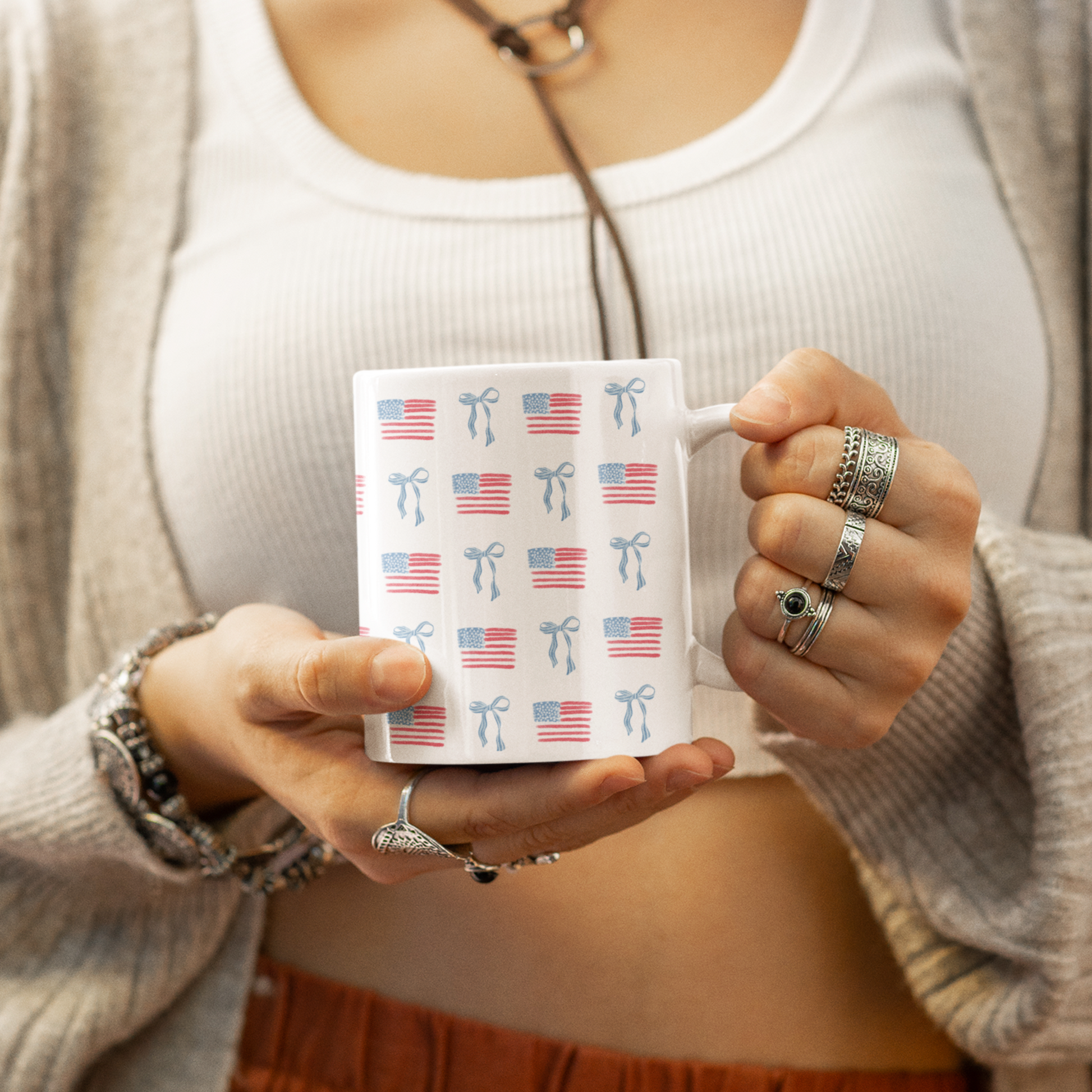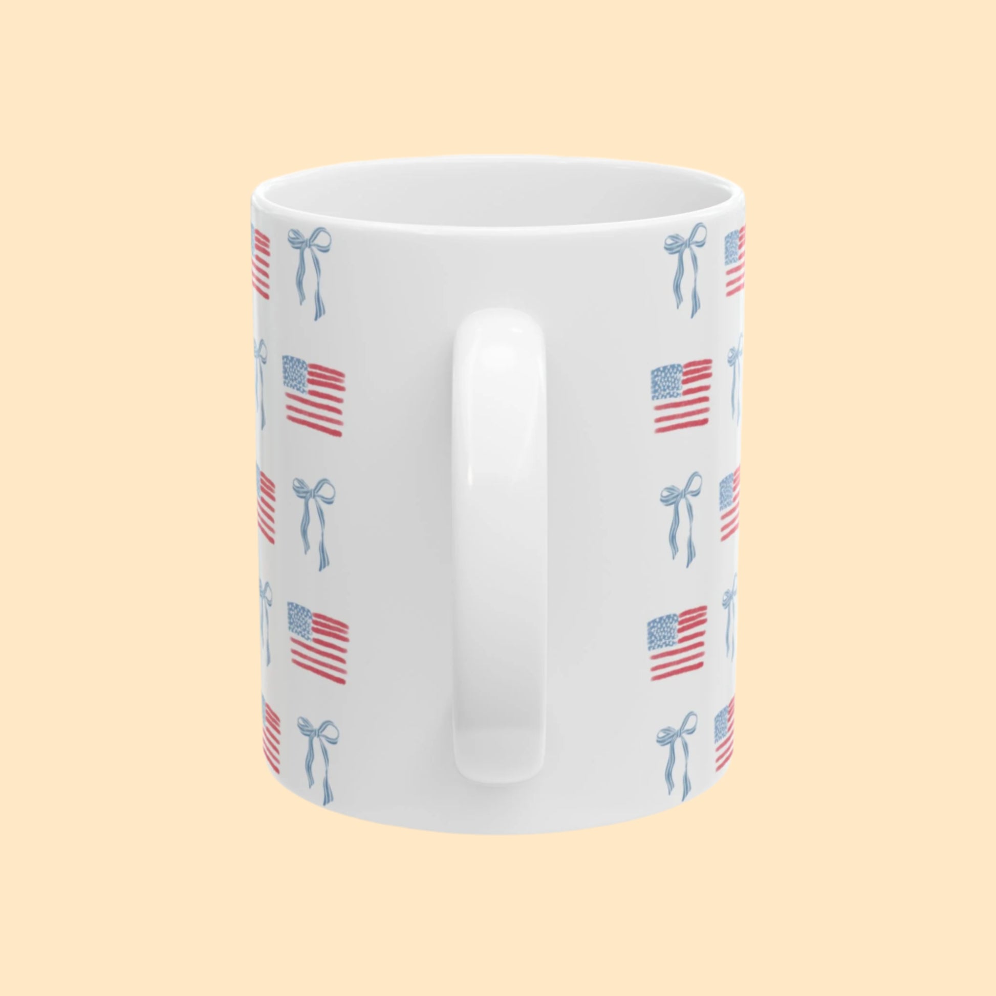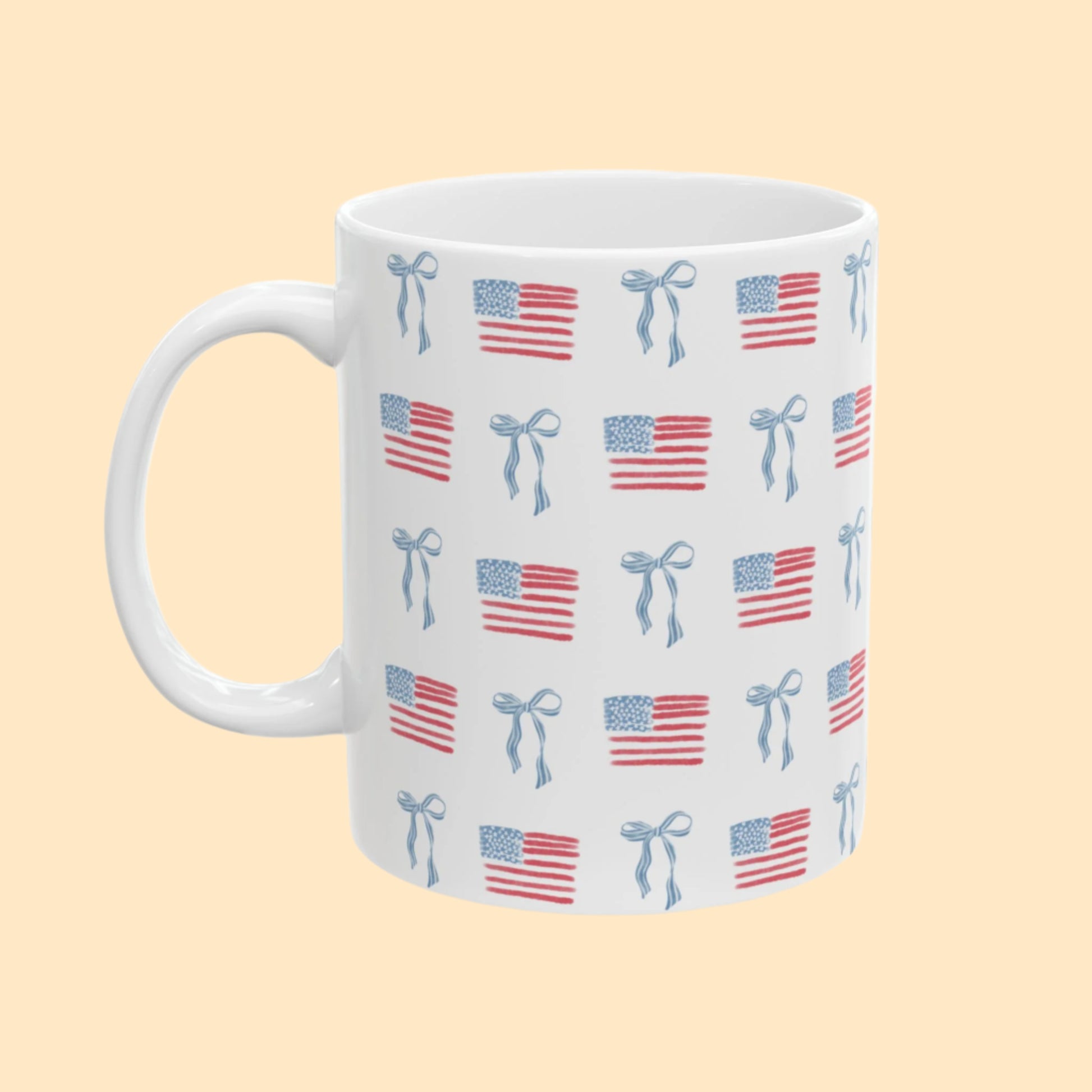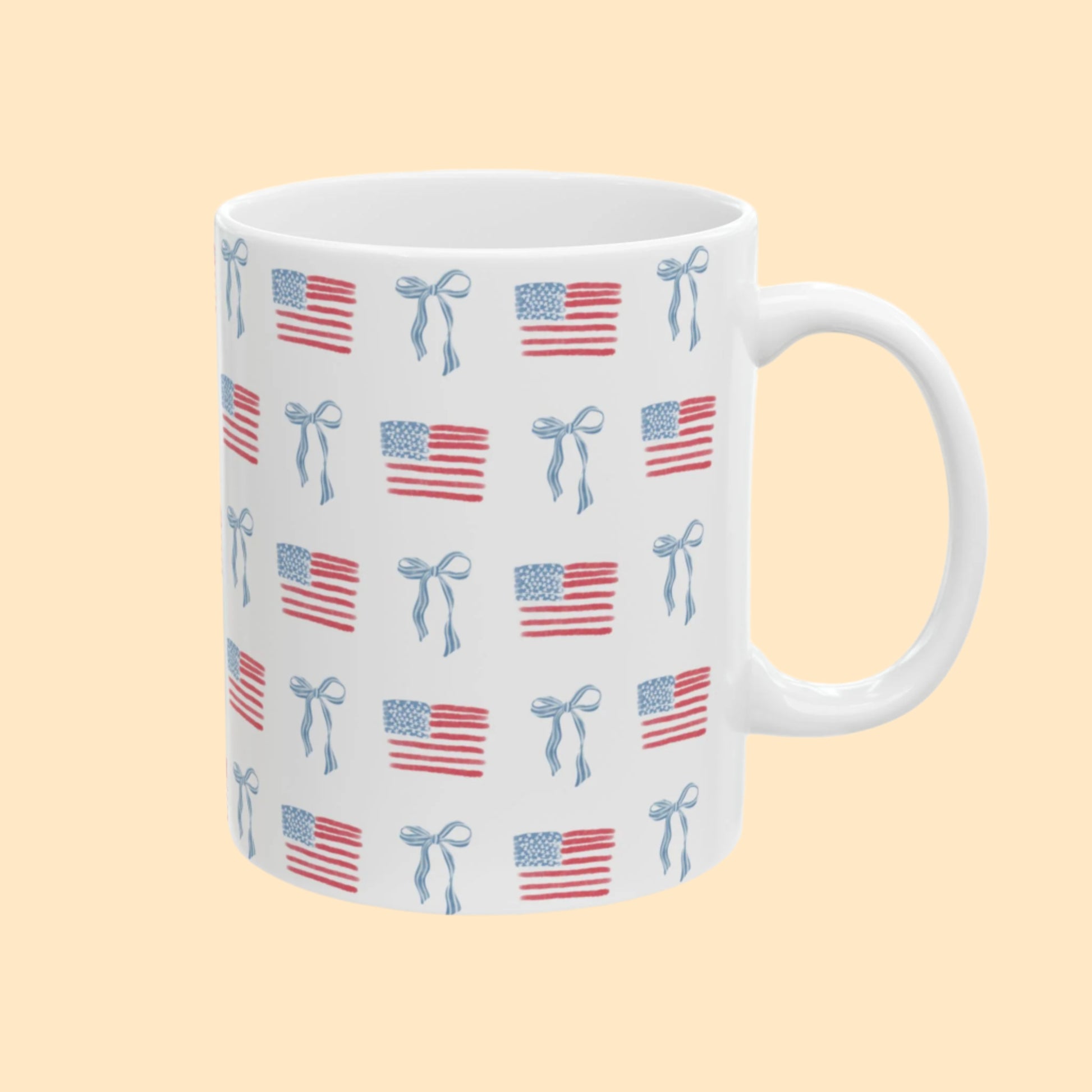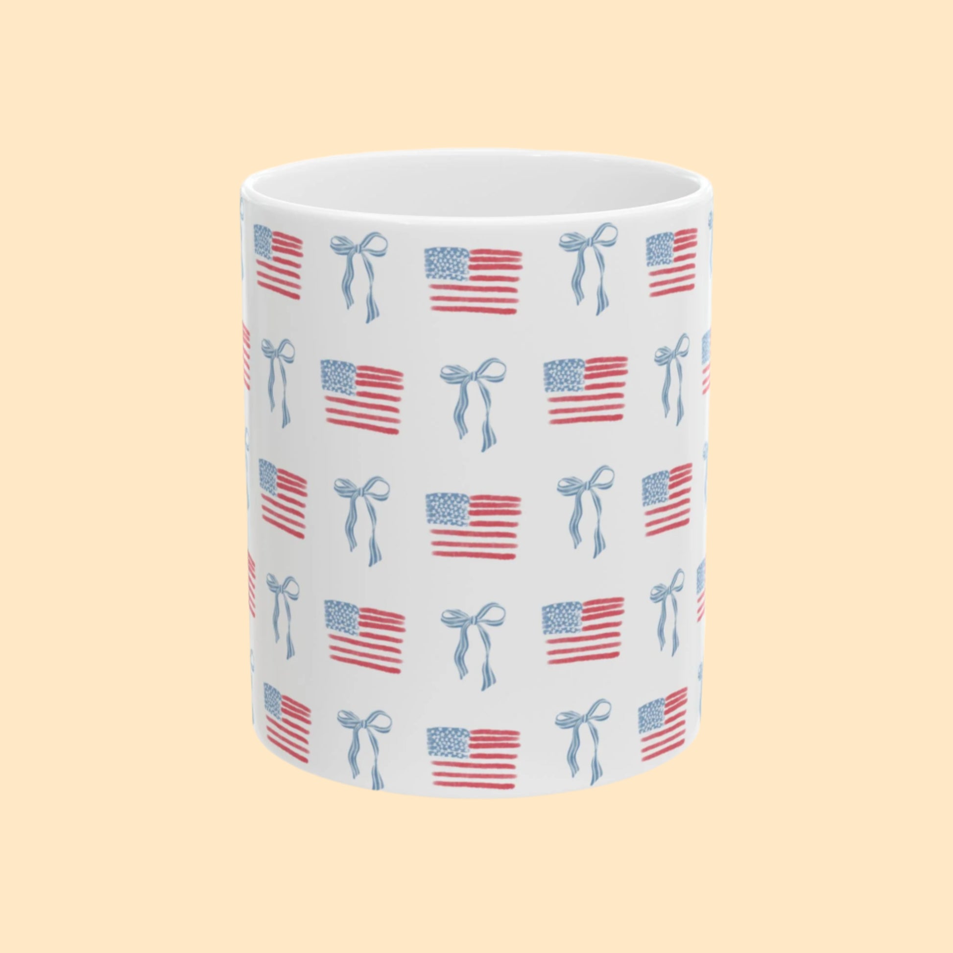 Sip in soft-toned celebration. This dreamy patriotic mug features flowing ribbons and a gentle U.S. flag motif in pastel hues—perfect for morning coffees on the porch, 4th of July BBQs, and small-town parades. A subtle yet festive way to show your love for summer, freedom, and charming Americana style.