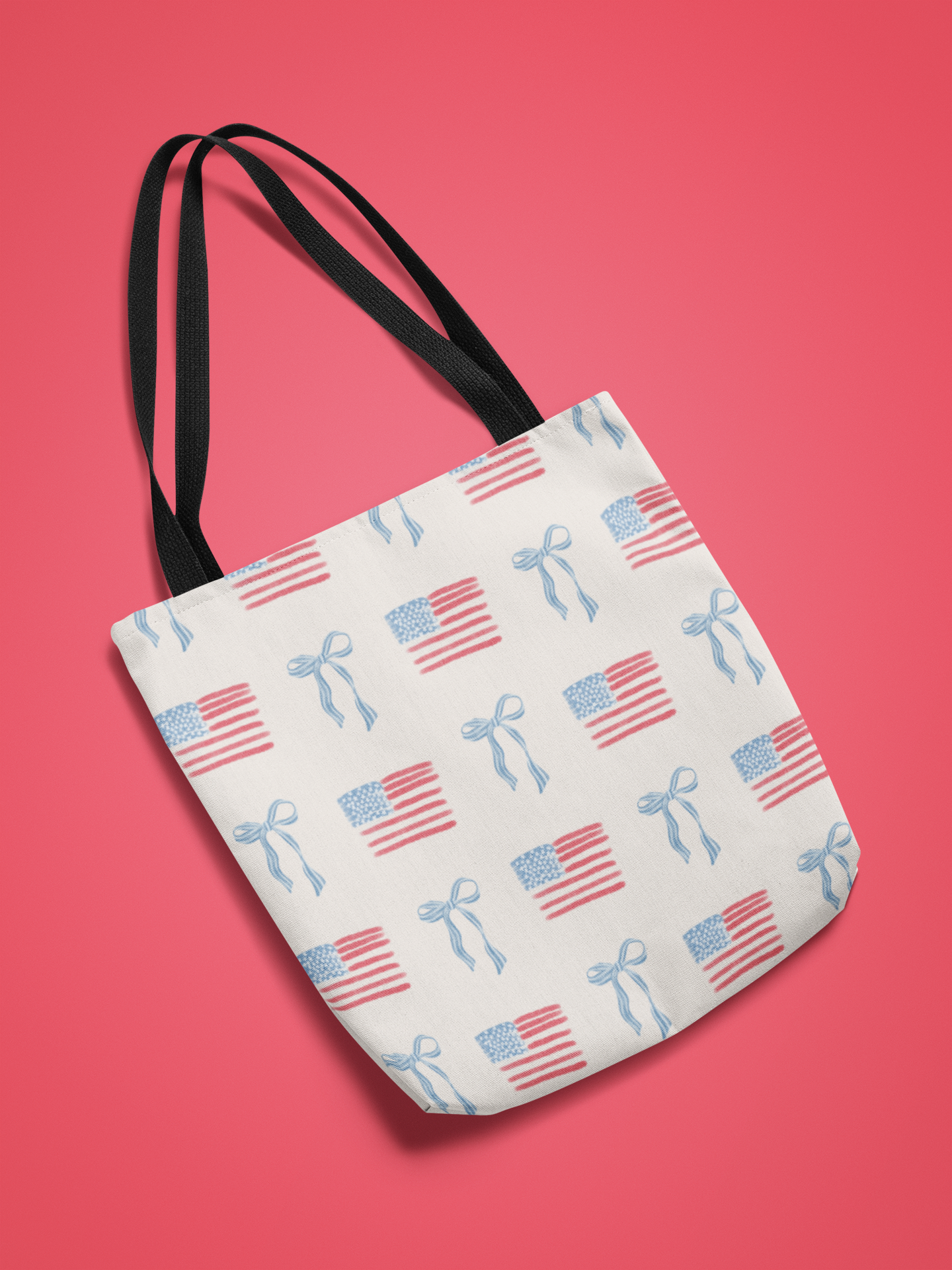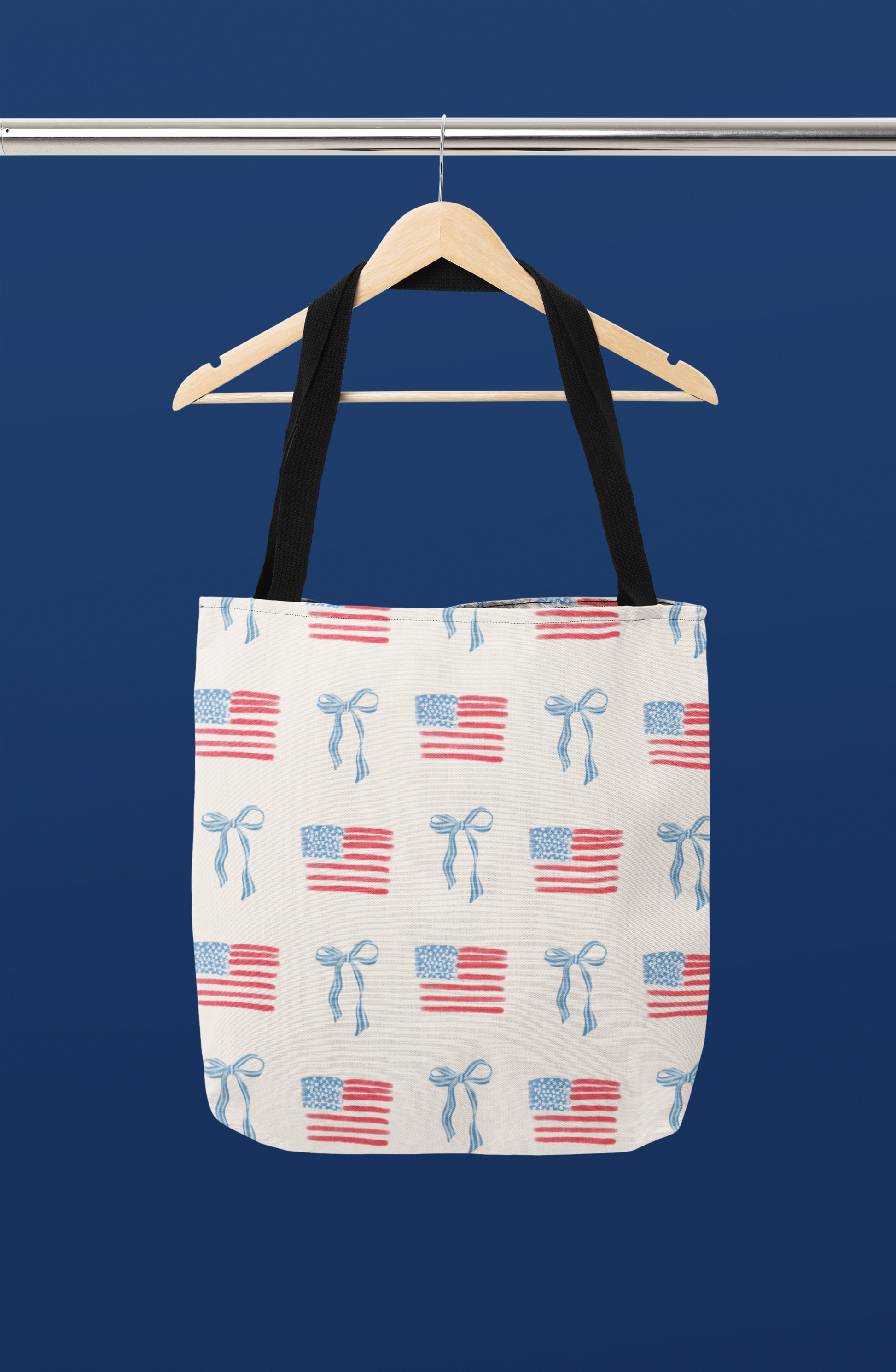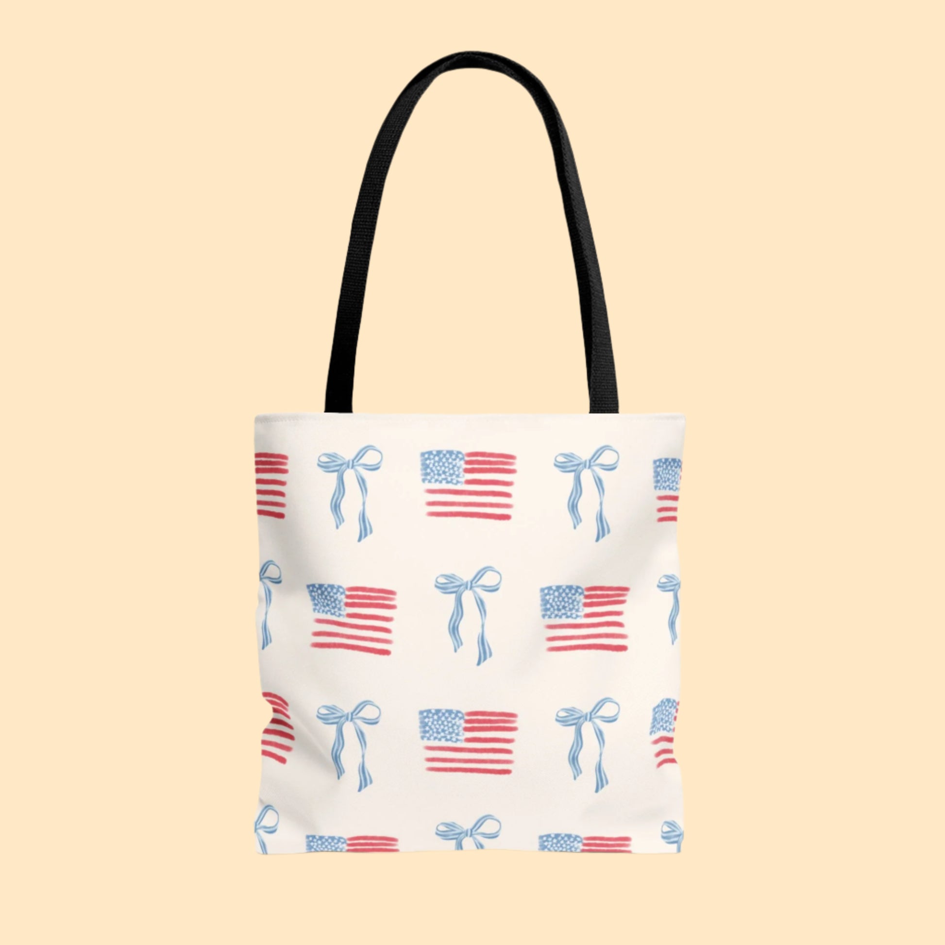 This soft-toned patriotic tote blends classic Americana with a dreamy, pastel palette. Featuring flowing ribbons and a subtle U.S. flag pattern, it’s a versatile piece for summer road trips, small-town parades, BBQs, and breezy weekend escapes.