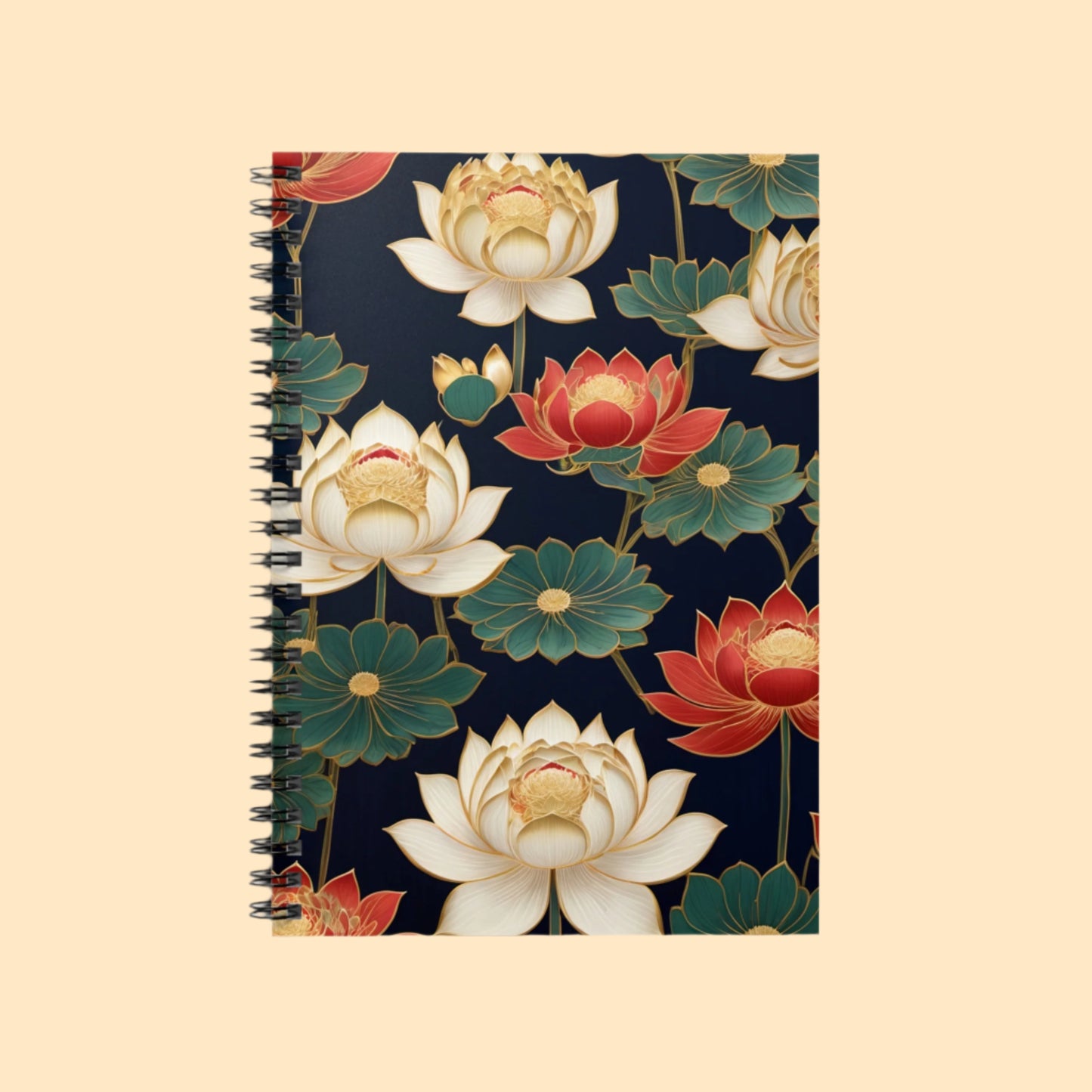 Symbolizing purity and resilience, the lotus flower graces the cover of this elegant spiral notebook in a striking red and white composition over a rich dark blue background. Its serene energy makes it a meaningful companion for journaling, planning, or quiet reflection. Featuring 118 ruled pages, a smooth matte finish, and a durable spiral binding, this journal is both inspiring and practical — perfect for capturing your daily thoughts or the highlights of your latest adventure.