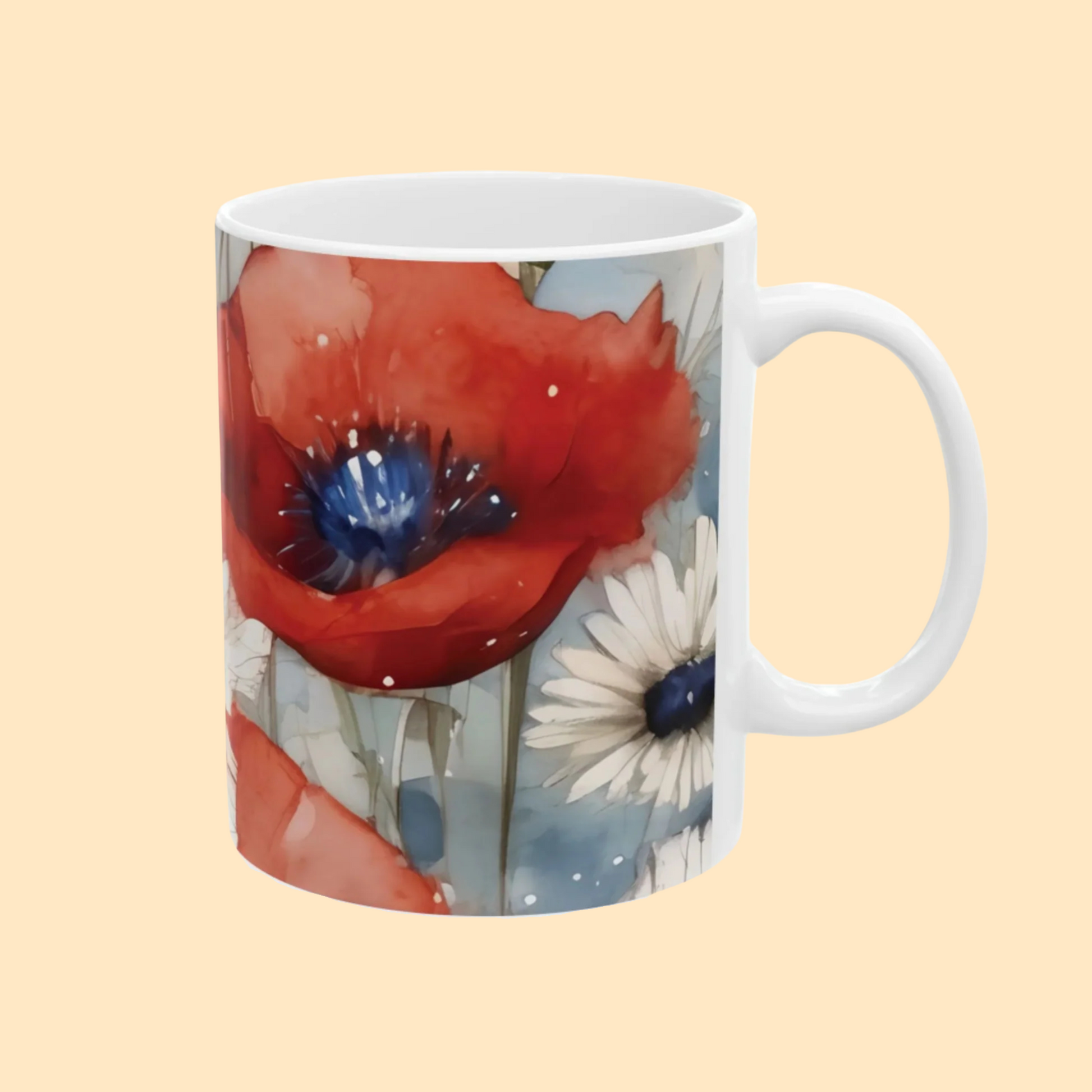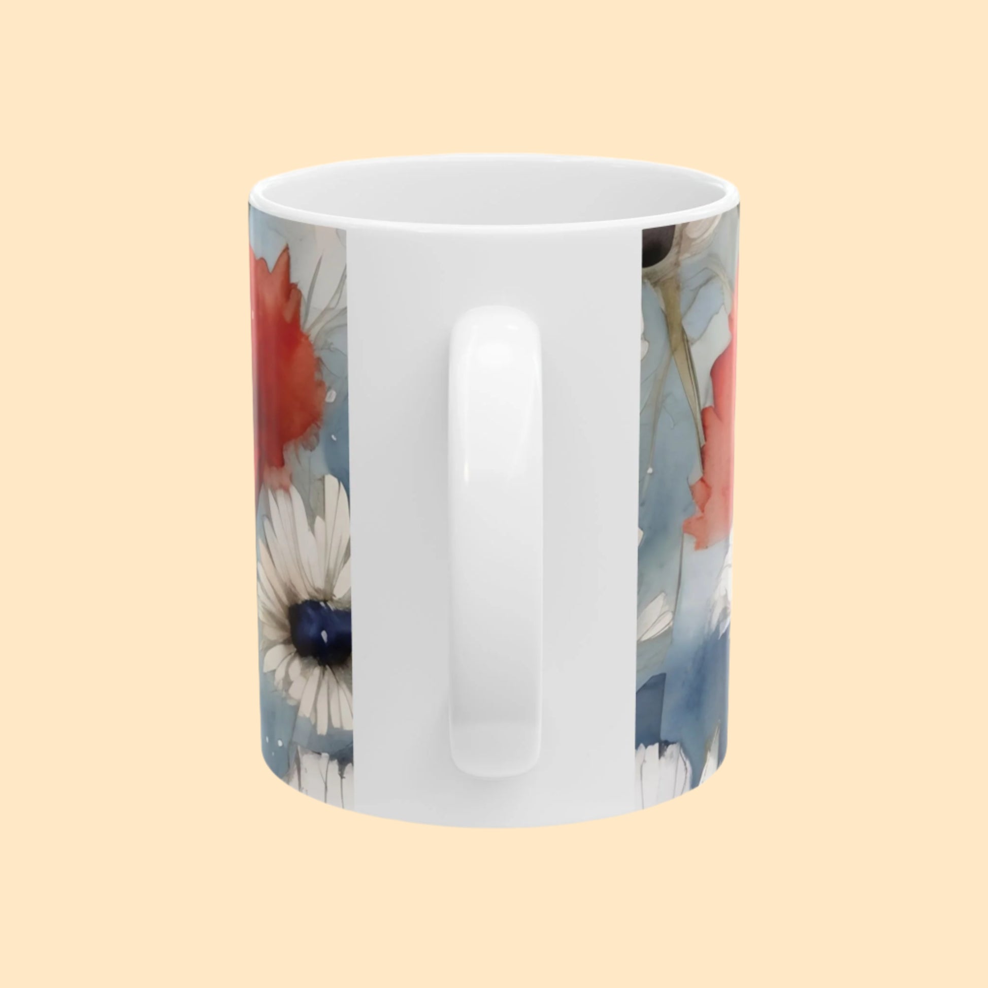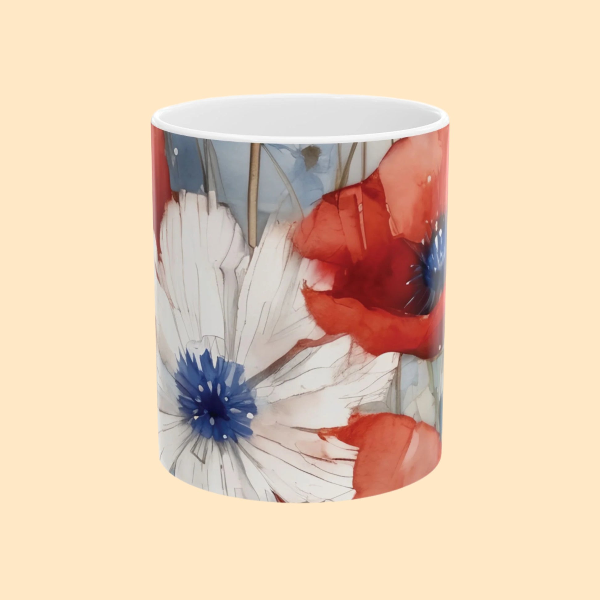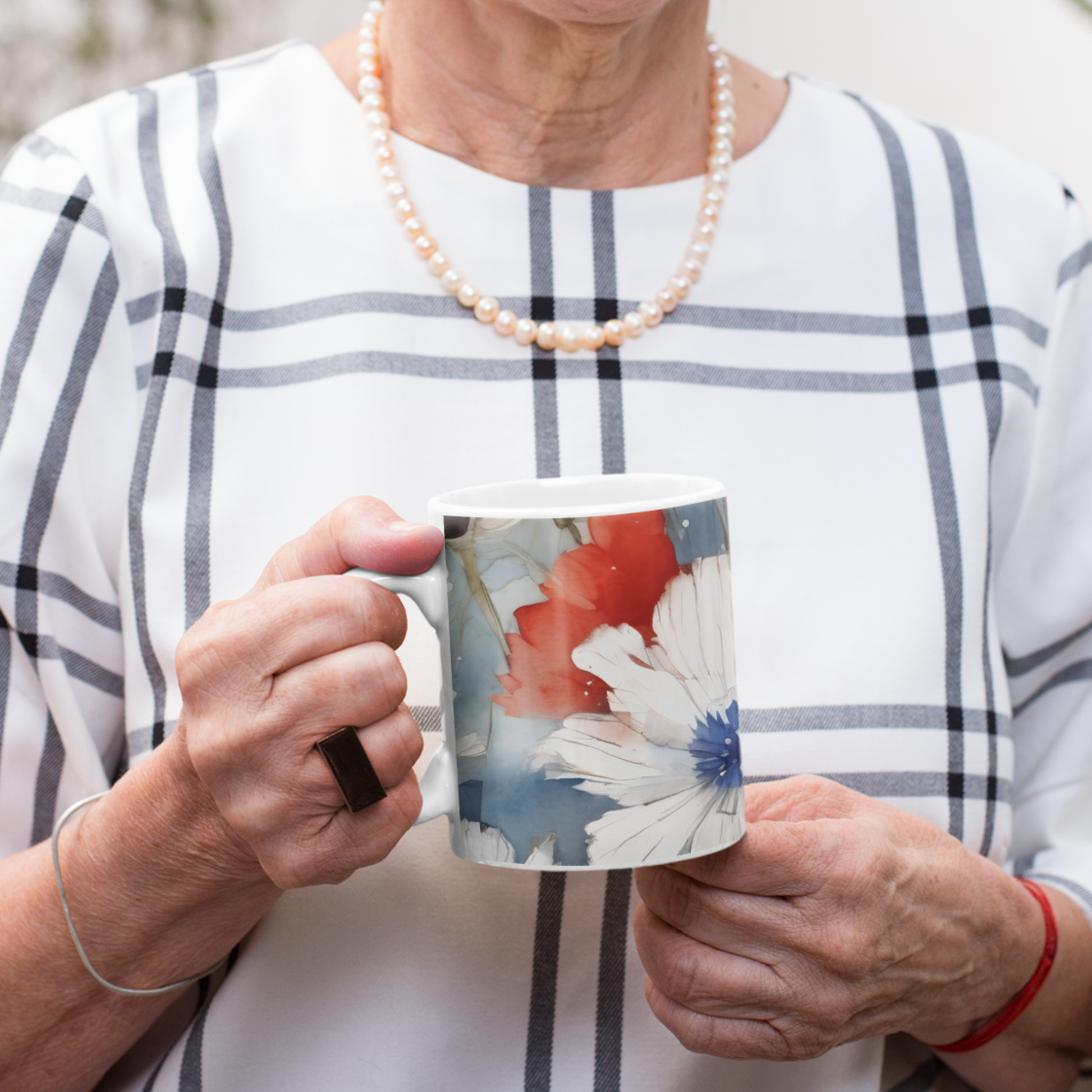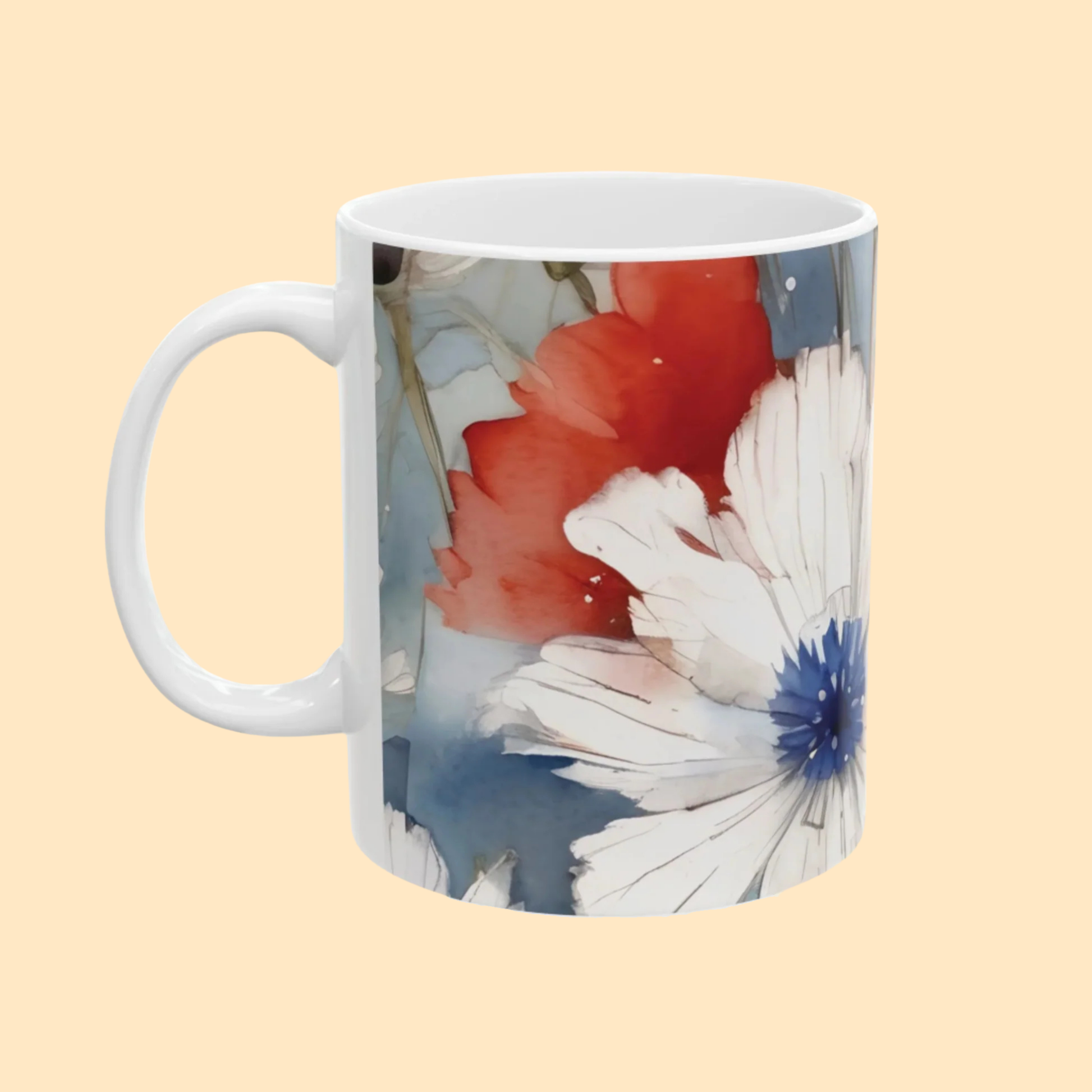 Celebrate freedom with a floral twist. This charming patriotic mug features delicate watercolor blossoms in soft red, white, and blue tones, bringing wanderlust-inspired freshness to your coffee routine. Perfect for picnics, breezy beach mornings, summer road trips, or relaxing on the porch after fireworks. A feminine and modern take on classic Americana.